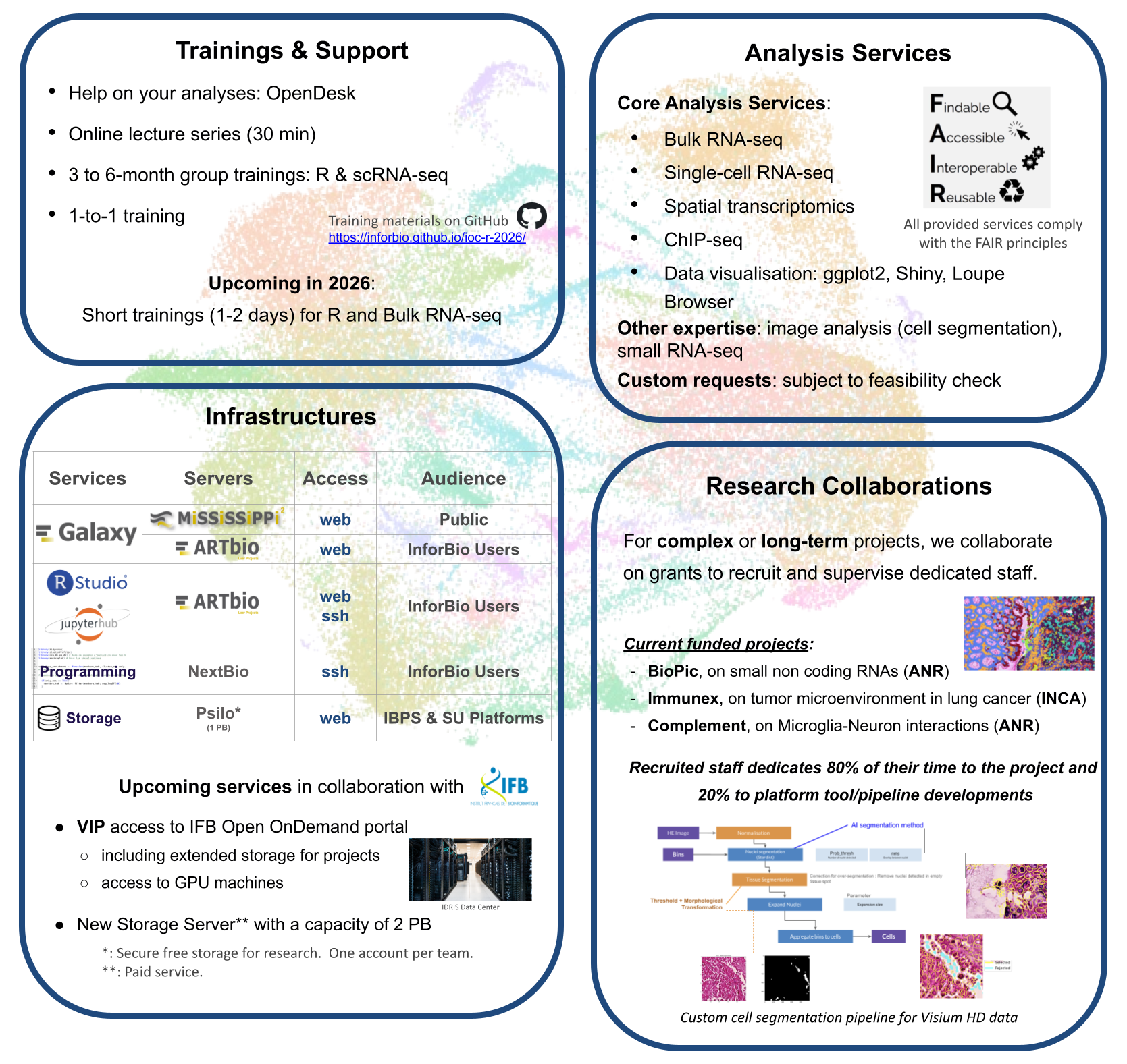 Accelerate your omics analyses with InforBio. We provide biological researchers with statistical and bioinformatics expertise, analysis tools, and high performance computing resources. Our team covers a broad range of applications, with specific core expertise in transcriptomics and epigenetics.